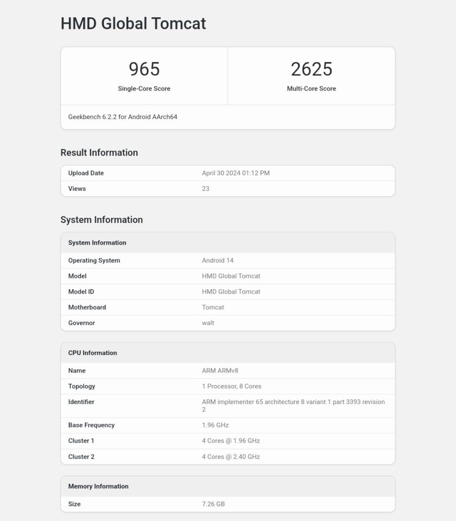 The HMD codenamed ‘Tomcat’ phone scored 965 on single-core Geekbench and 2625 on multi-core Geekbench. According to the listing, it is an octa-core processor with a cluster of 4+4. There is a base frequency of 1.96GHz and 2.4GHz for the two clusters.