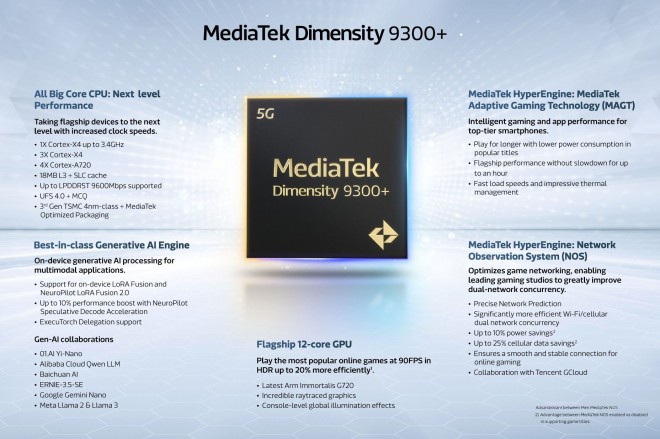 It also supports 01.AI Yi-Nano, Alibaba Cloud Qwen, Baichuan AI, ERNIE-3.5-SE, Google Gemini Nano, and Meta Llama 2 and Llama 3. Additionally, the Dimensity 9300+ supports on-device LoRA Fusion in conjunction with NeuroPilot LoRA Fusion 2.0.