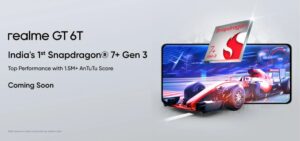 In India, the GT 6T will launch this month, according to Realme. It is the first non-Neo model of the GT series phone to feature the new Qualcomm Snapdragon 7+ Gen 3 SoC.