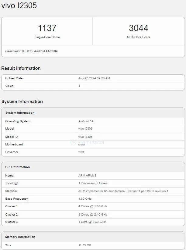 IQOO India’s new teaser suggests the l2305 model number might belong to the upcoming smartphones. It scored 1137 points in a single-core test, and 3044 points in a multi-core test for the upcoming iQOO smartphone.