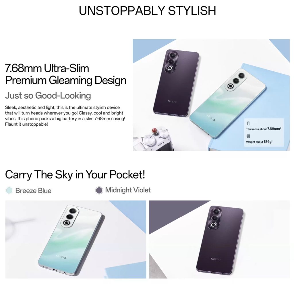 Users can operate the device with wet hands thanks to OPPO’s Splash Touch technology. With a corner cushioning thickness of 7.68 mm and a weight of 186 grams, the smartphone will sport a high-quality Air Cushion Armour Case.
