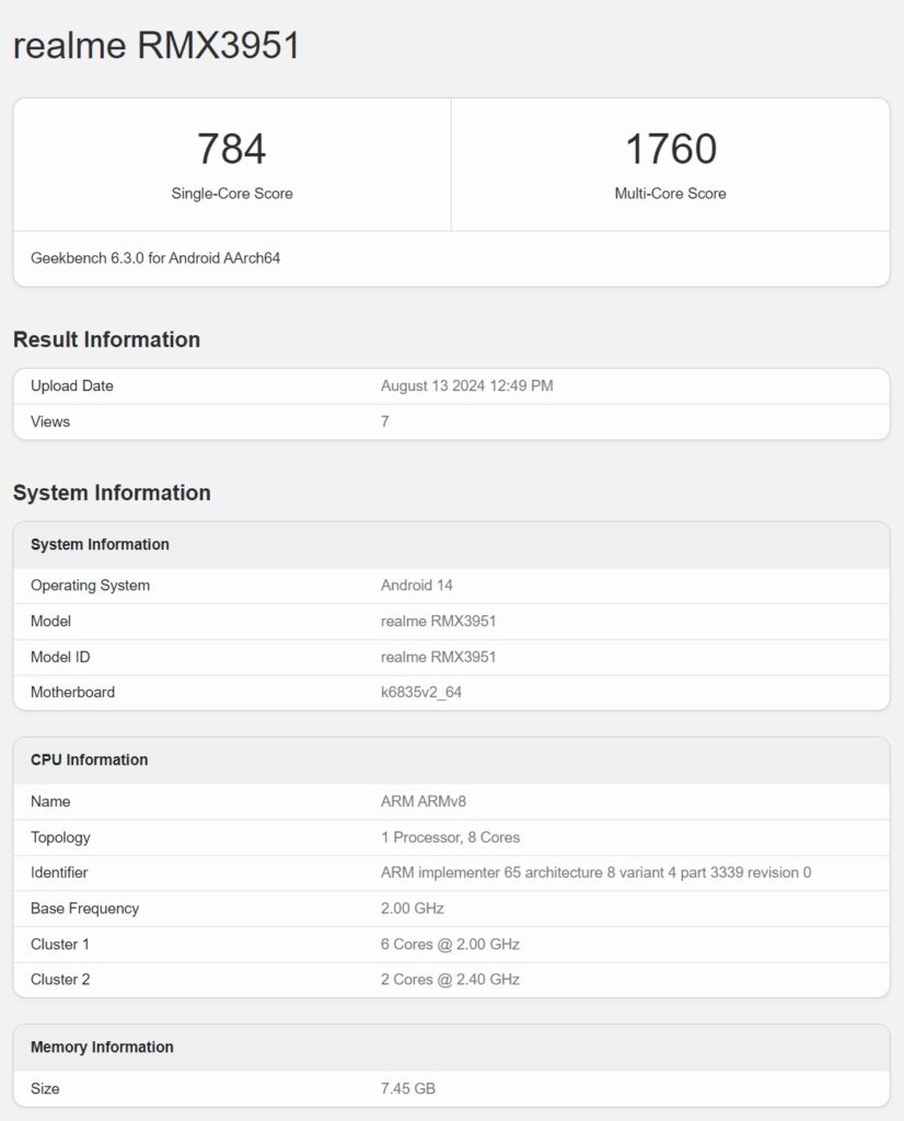 Realme’s RMX3951 chipset is now listed on Geekbench. This is the global version of the Realme 13 5G. The listing indicates that it is powered by a MediaTek chip with model number MT6835. According to the listing’s source code, the chip includes the Mali-G57 MC2 GPU. This confirms that the Realme 13 5G will be another phone powered by the Dimensity 6300.