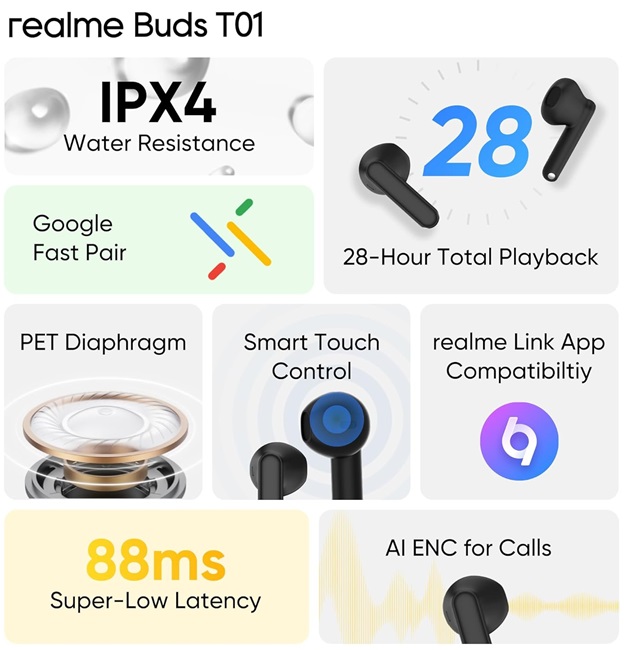 Realme Buds T01 have a 40mAh battery that offers 7 hours of battery life per earbud. With the 400mAh storage case, the battery lasts 28 hours. The battery lasts 120 hours on a 10-minute charge. For a fast and instant connection, the audio device has Bluetooth 5.4 and Google Fast Pair support.