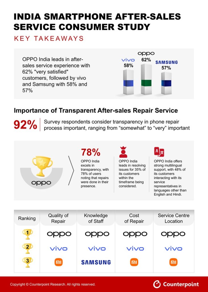 - Speed of resolution: OPPO India leads in resolving issues for 35% of its customers within an hour. This is ahead of Samsung at 34%.