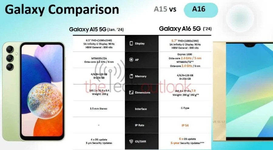 The new Galaxy A16 5G sports a 6.7-inch FHD+ display with a 90Hz refresh rate. The notch carries a 13MP selfie shooter with an aperture of f/2.0. On the back, the Galaxy A15 features triple-rear cameras with a 50MP main shooter with f/1.8 aperture, along with a 5MP ultra-wide & 2MP depth sensor with an aperture of f/2.4 with LED flash.