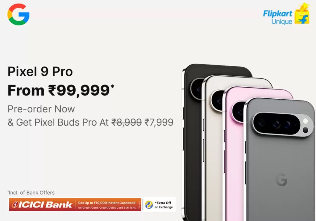 The Google Pixel 9 Pro is available in Porcelain, Rose Quartz, Haze and Obsidian colors and costs Rs. 1,09,999 for the 16GB + 256GB model in India. Pre-orders are now available on Flipkart, as well as at more than 150 Croma and Reliance Retail stores nationwide. ICICI Bank Credit and Debit Cards offer Rs. 10,000 off & Pixel Buds Pro are available for Rs. 7999.