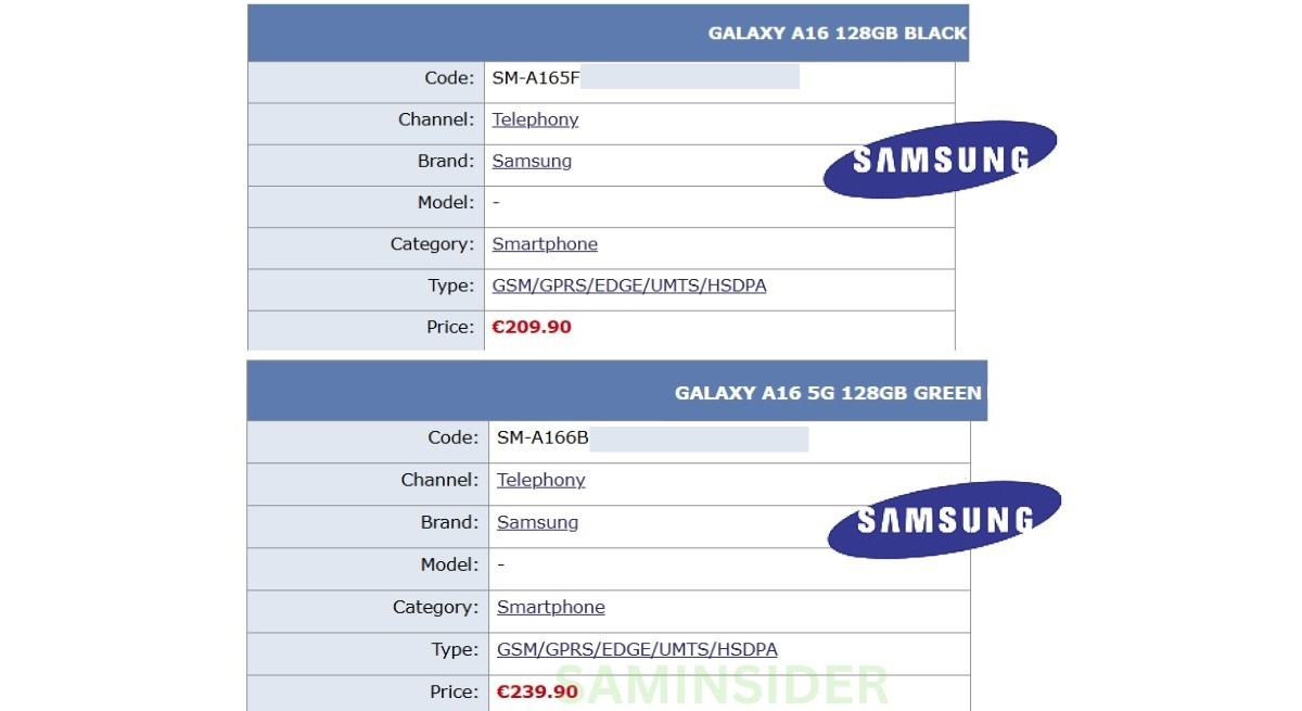 The Galaxy A16 4G will cost €209.90, while the Galaxy A16 5G will cost €239.90. They are both offered with 128GB of storage, but the database does not include RAM information.
