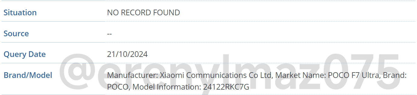 The IMEI listing for the Poco F7 Ultra now shows model number 24122RKC7G. X user spotted it alongside the Poco F7 Pro. The Poco F7 Ultra’s model number matches that of the Redmi K80. The Poco F7 Ultra may be rebranded as a Chinese Redmi K80.