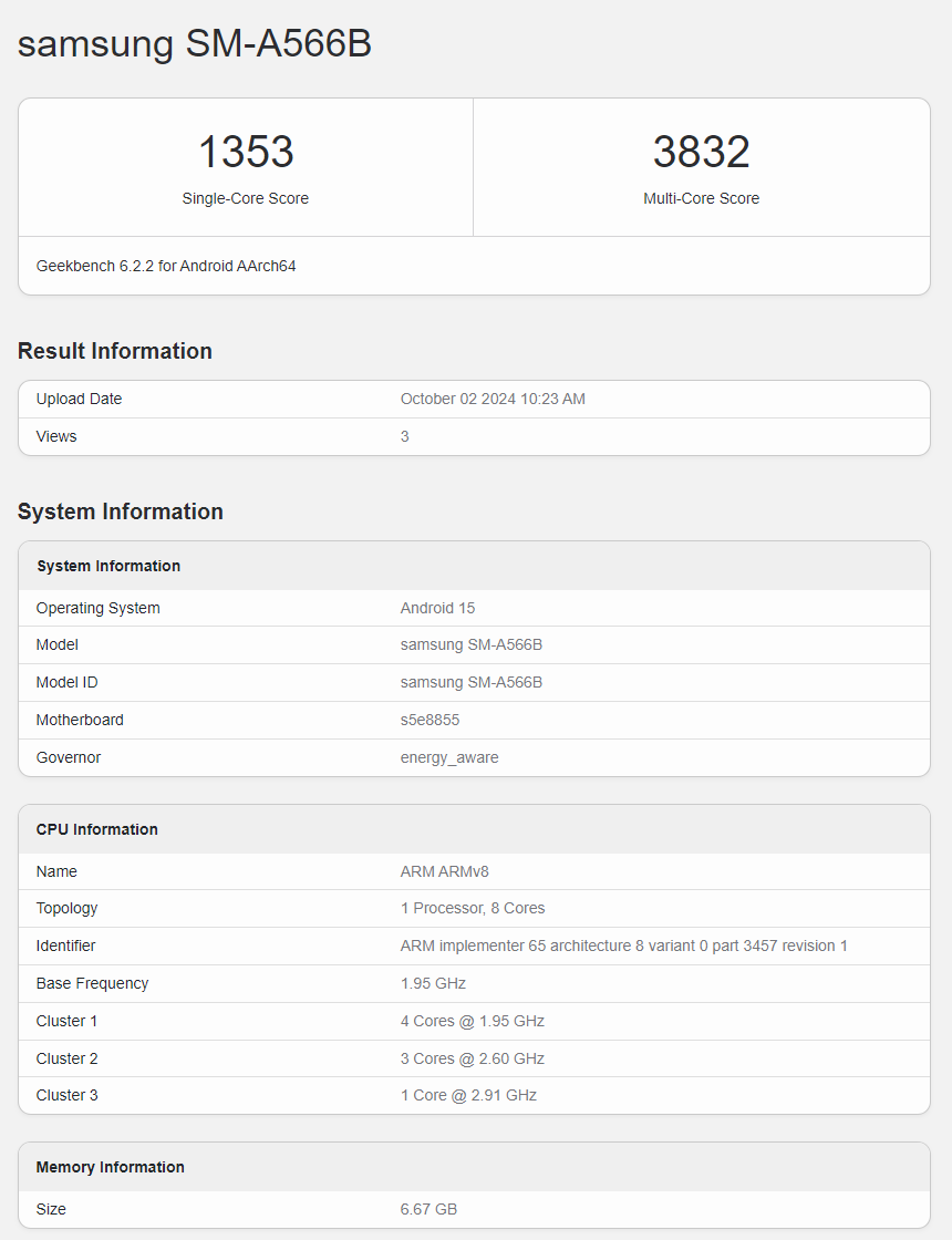 As expected, the phone’s model number is SM-A566B and the chipset is S5E8855.