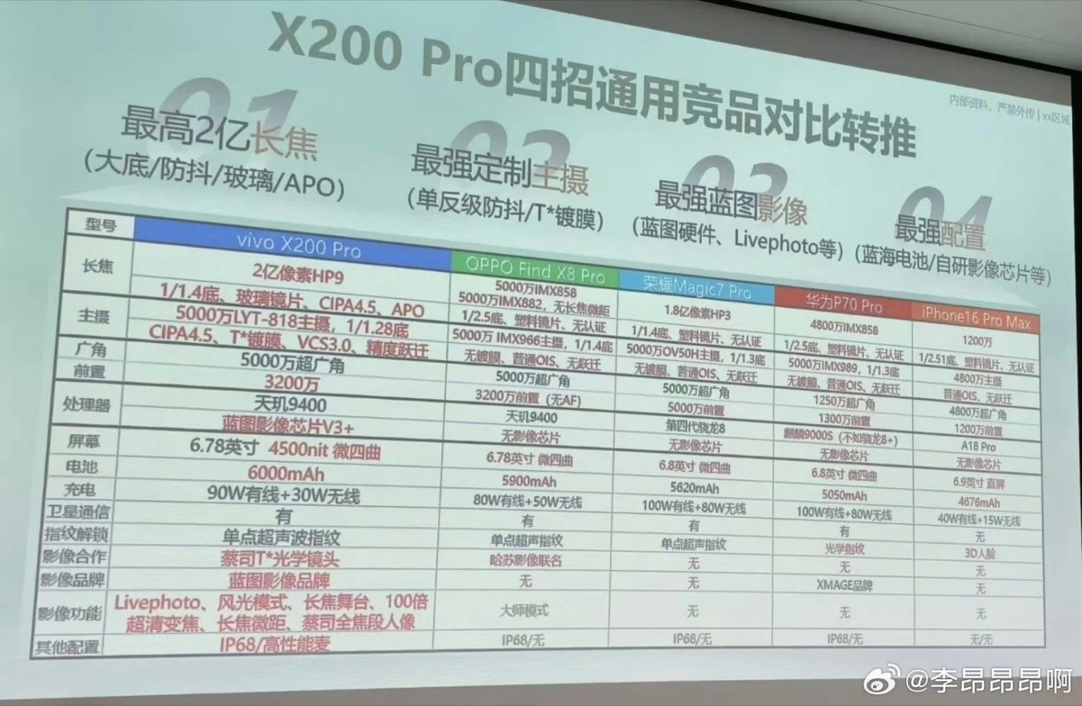 Vivo’s X200 Pro will compete with other brands’ “Pro” models this month. The Vivo X200 Pro and Oppo Find X8 Pro are compared in a leaked presentation image. Weibo has revealed the Honor Magic 7 Pro, Huawei Pura 70 Pro, and Apple iPhone 16 Pro Max. It is recommended that readers take the leak with a grain of salt since the authenticity of the image has not been verified.