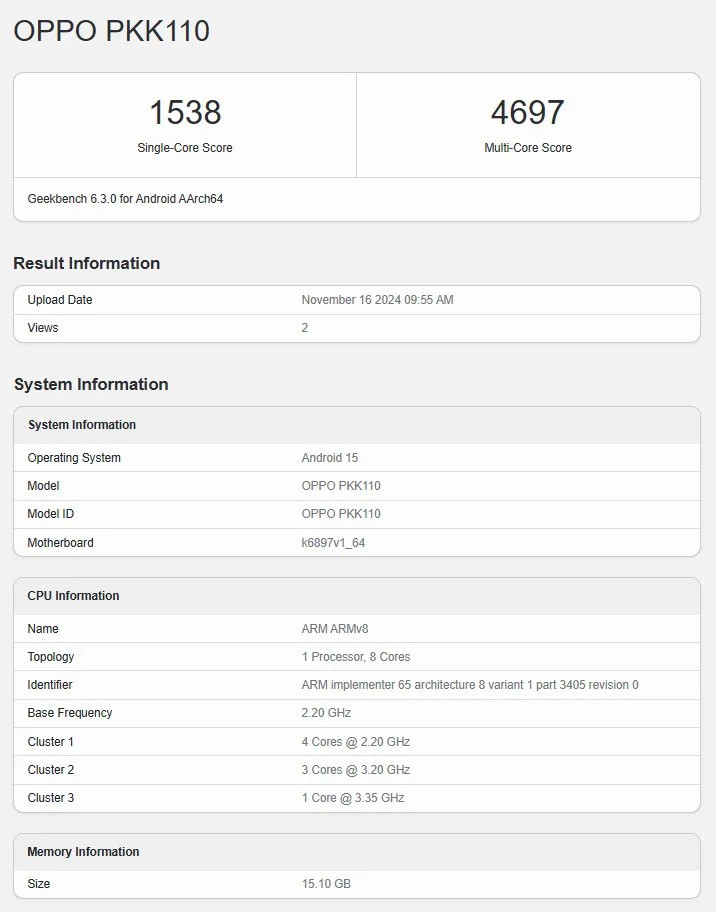 A new Oppo smartphone, identified by the model number PKK110, has surfaced on the Geekbench database, suggesting it could be the Chinese version of the Reno 13 Pro, while the global variant carries the model number CPH2697.