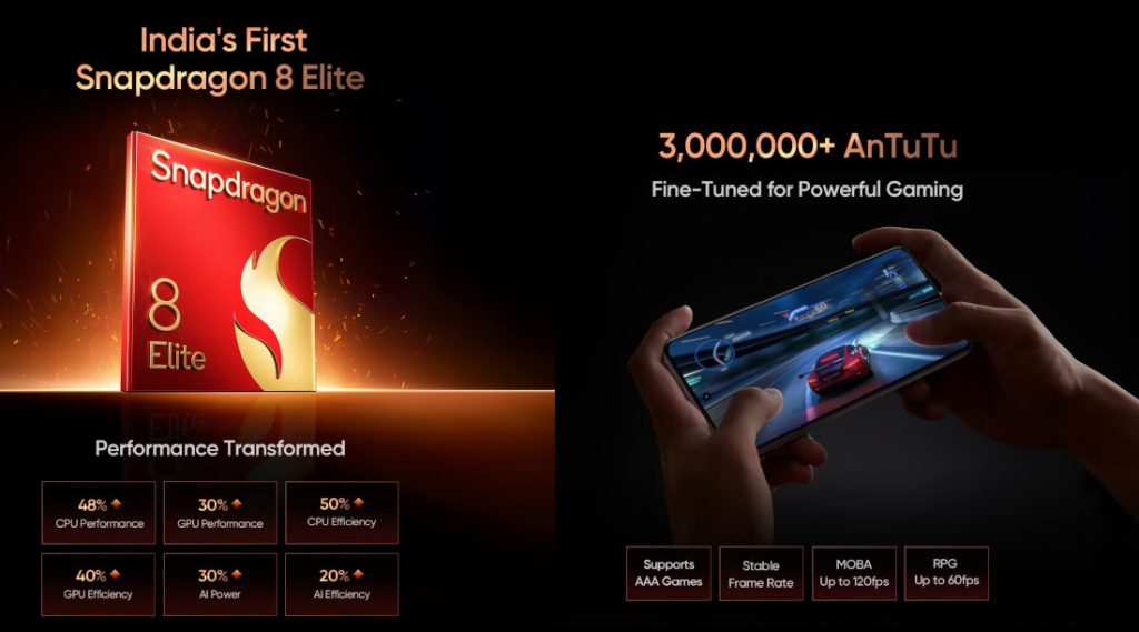 With the Snapdragon 8 Elite chipset, the Realme GT 7 Pro will feature a 2+6 Oryon core configuration paired with a Hexagon NPU. As compared to the last-generation Snapdragon 8 Gen 3 chipset, it will offer 45% more performance.