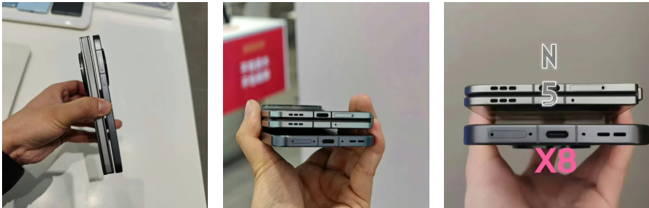 Recently, a set of images from Weibo provided a clear view of the Find N5’s design. Notably, these images include comparisons with the Oppo Find X8, showing that the foldable is slightly thicker when viewed from the side, although the difference becomes less apparent from the bottom.