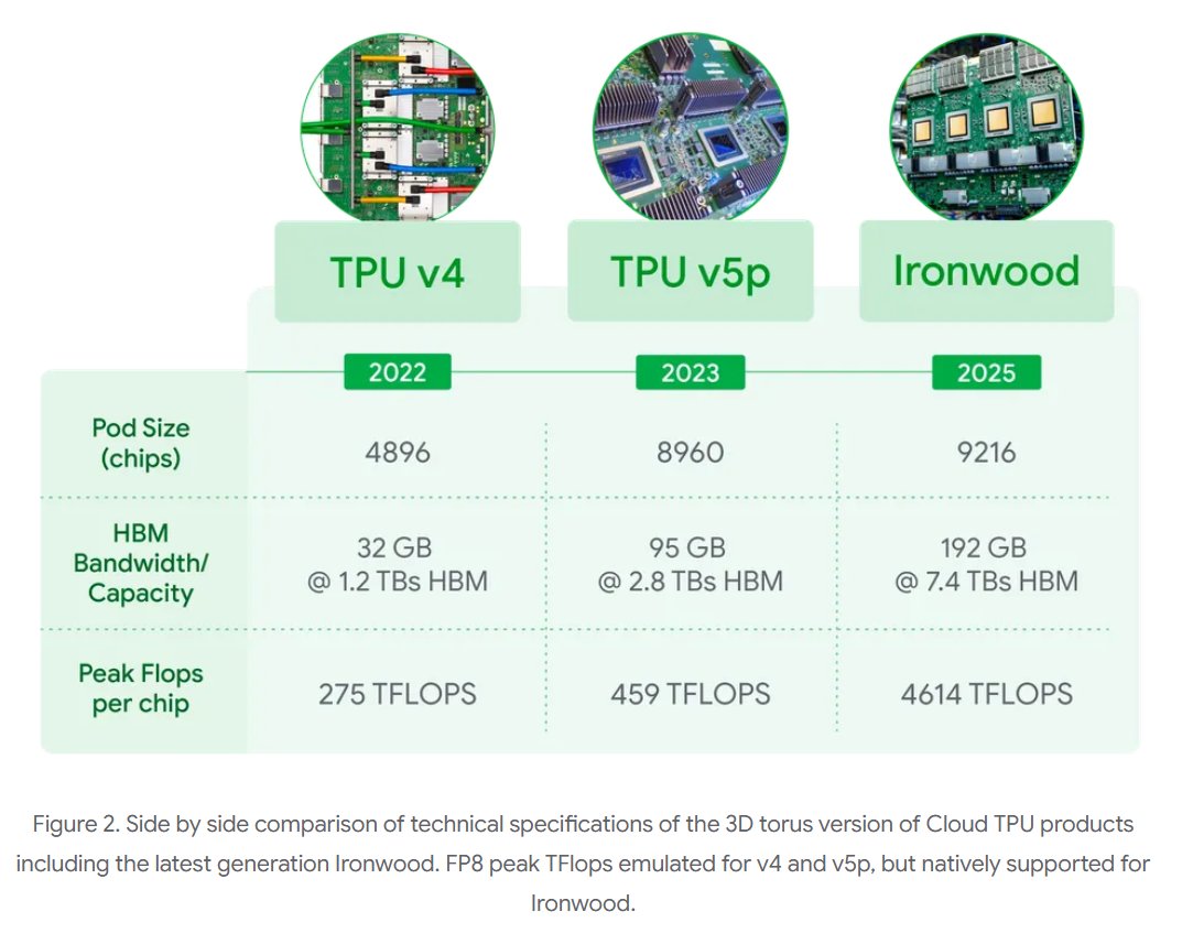 Google released its TPU v5p chip in 2023. This chip has 9860 chips in a pod, while Iron has 9216 chips in a pod. As a result, overall capabilities increase dramatically. The Ironwood has 192GB of memory, which is a 102% increase over TPU v5p (95GB). The combined TFLOPS of Ironwood and TPU v5p are more than 10 times as high, with 4.614 Exaflops compared to 459 TFLOPS for TPU v5p.