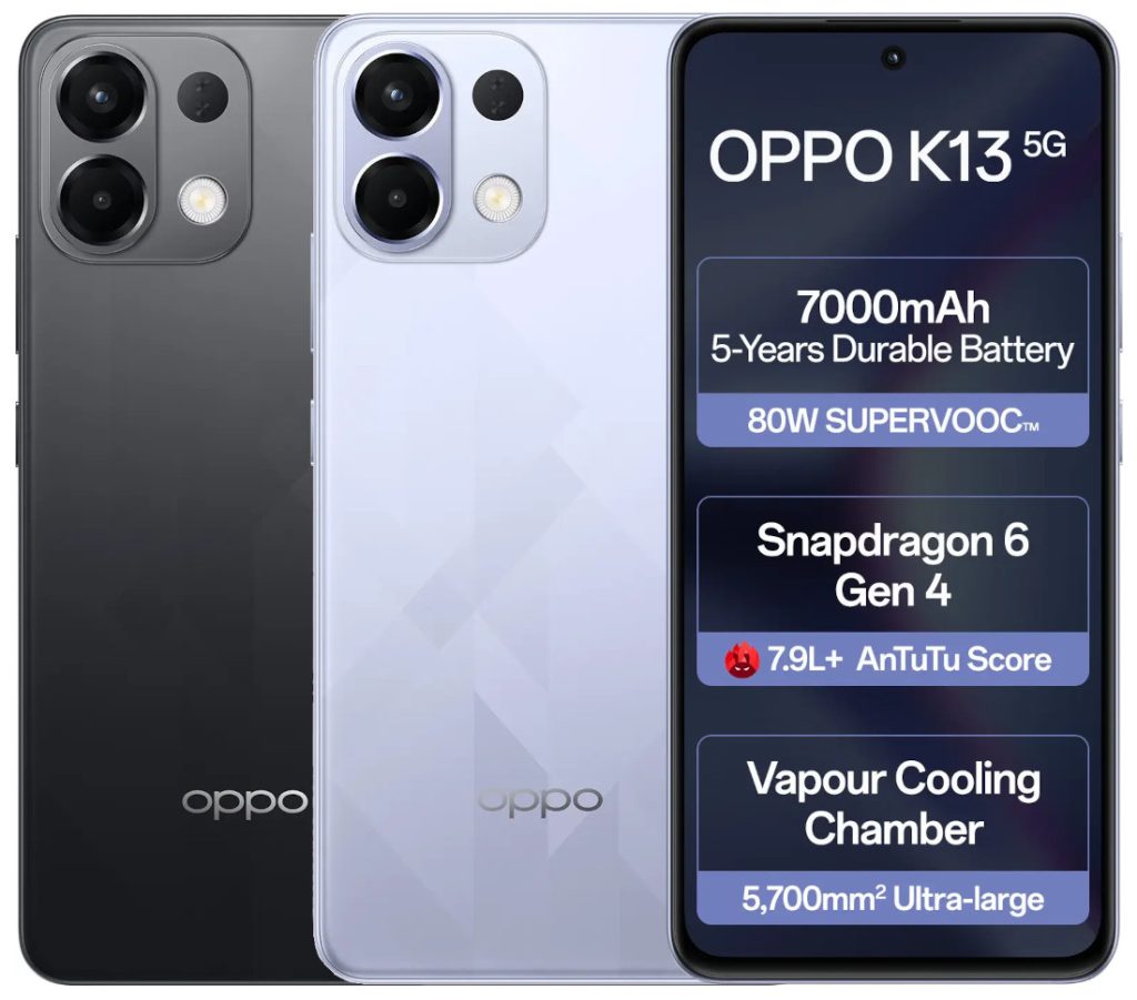 The OPPO K13 5G will arrive with a 6.67-inch FHD+ (2400×1080p) display with a 120Hz refresh rate. It is powered by a Snapdragon 6 Gen 4 SoC coupled with 8GB RAM and 128GB/256GB storage space.