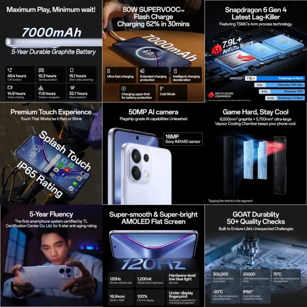 The device will feature dual rear cameras: a 50MP main sensor, a 2MP macro sensor with LED flash, and a 16MP selfie shooter under the punch-hole notch. The OPPO K13 5G has a 7000 mAh battery with 80W fast charge support.