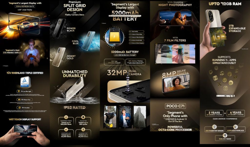 With a 6.88-inch screen (likely LCD), Poco C71 will feature a refresh rate of up to 120 Hz. Despite its low blue light emissions and minimal screen flicker, it is touted as the “segment’s most eye-friendly display.”