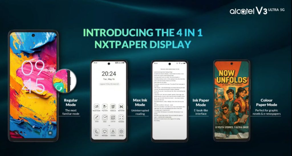On Alcatel’s V3 Ultra 5G and V3 Pro 5G smartphones, NXTPAPER INK paper mode provides a full-colour electronic paper display experience and Ink Paper mode for an eBook-like reading experience. SGS has also certified these as low blue light. The screen has an anti-reflective coating. The phones promise up to 7 days of reading in Max Ink Mode.