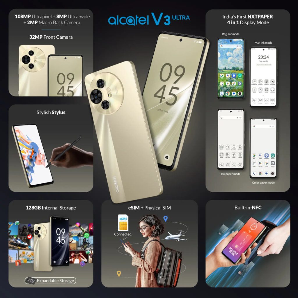 In partnership with NXTCell, Alcatel India has launched the V3 Ultra 5G, V3 Pro 5G, and V3 Classic 5G smartphones. For the first time, the 120Hz anti-glare NXTPAPER display on the Alcatel V3 Ultra 5G and V3 Pro 5 G is introduced in India.