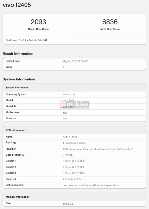 The device scores 2,093 points in the single-core test and 6,836 points in the multi-core test on Geekbench. It will come with Android 15 OS pre-installed.