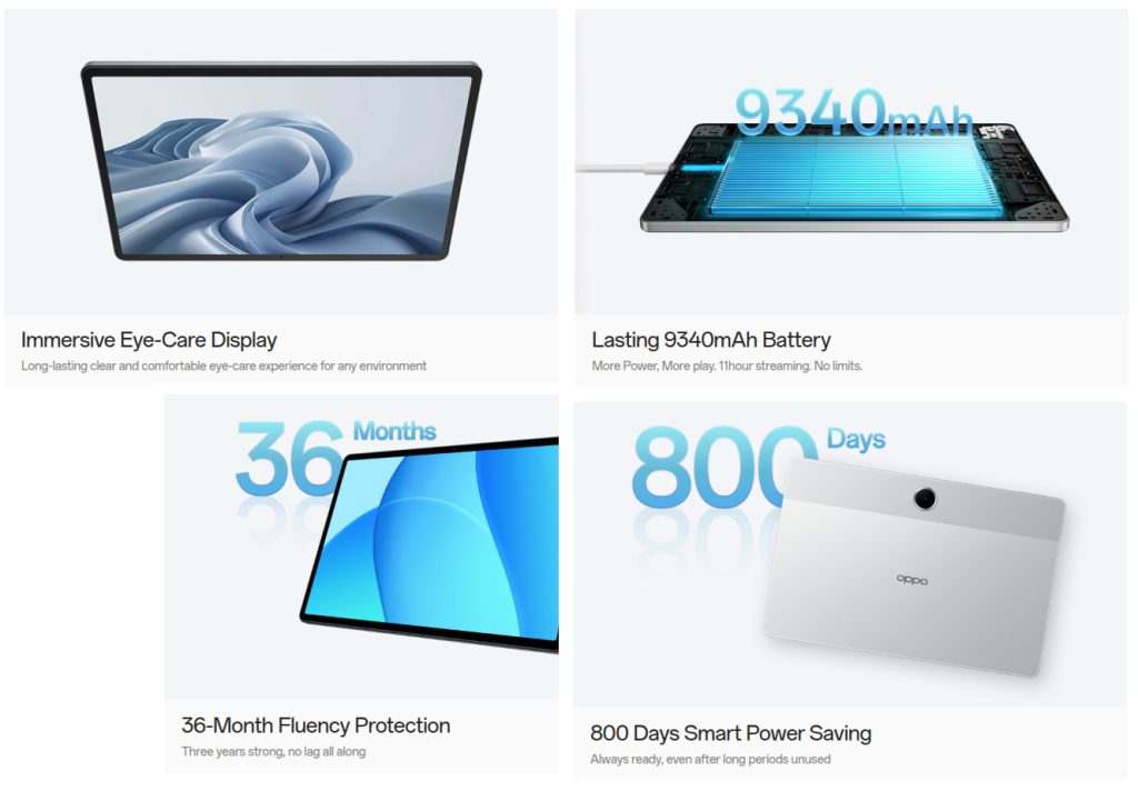 According to OPPO, Advanced Smart Power Saving Mode automatically saves energy by shutting off the device after seven days of inactivity. It offers up to 800 days of intelligent standby, ensuring your tablet remains functional even after extended periods of inactivity.