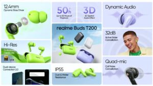 Realme has officially unveiled the Buds T200, expanding its Buds T series lineup as previously promised. These earbuds showcase a sleek crystal alloy design and are equipped with a 12.4mm Dynamic Bass driver. They also feature LDAC support, Hi-Res audio certification, and offer up to 32dB of Active Noise Cancellation.
