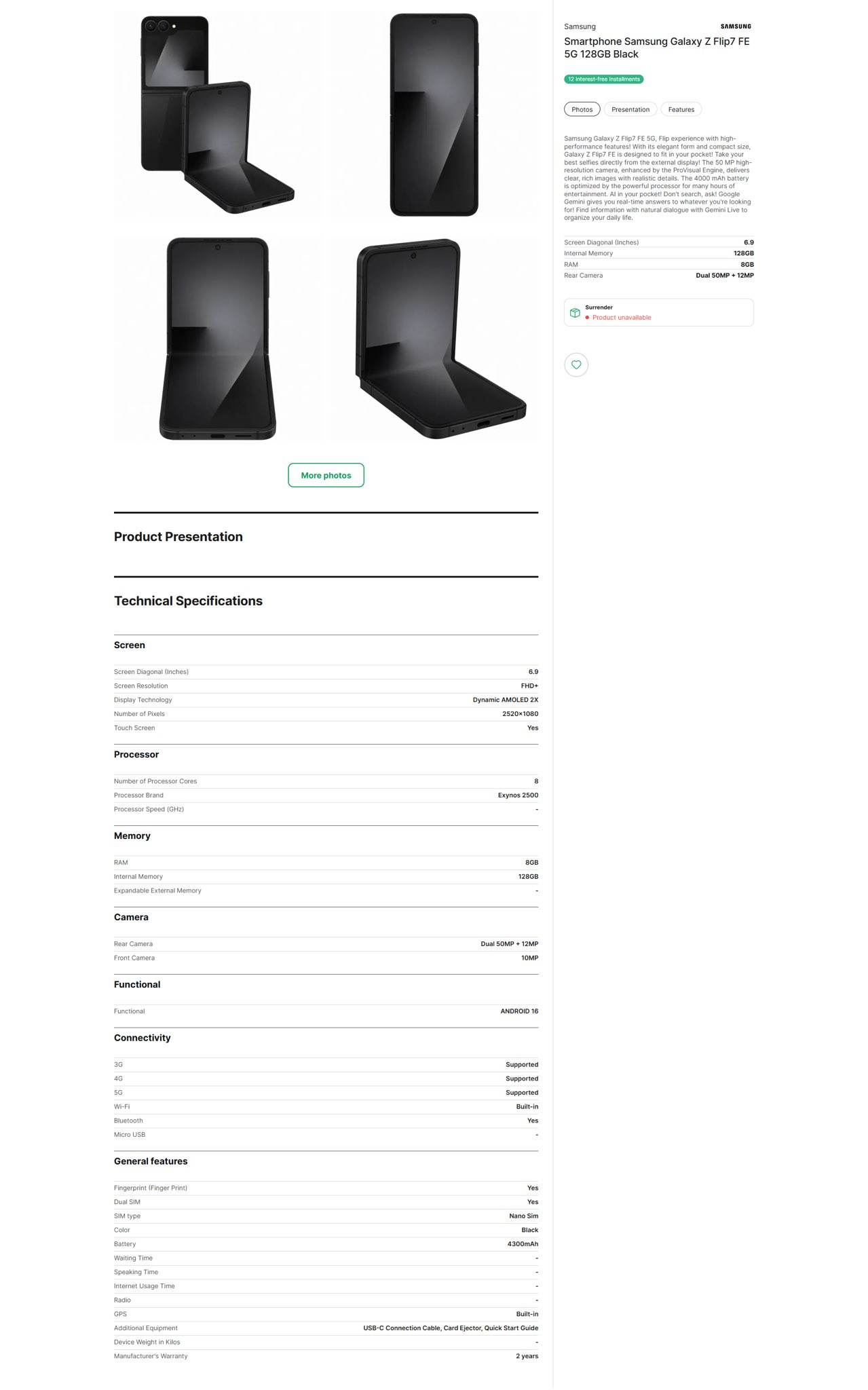 The Galaxy Z Flip7 FE 5G features a side-mounted fingerprint scanner and is rated IPX8, making it dust- and water-resistant. The connectivity option includes Dual SIM (1-eSIM + 1-SIM) with Dual 4G LTE and VoLTE support, as well as 5G. There is also Wifi 6E, A-GPS, GLONASS, Bluetooth 5.3, USB Type-C port, and NFC.