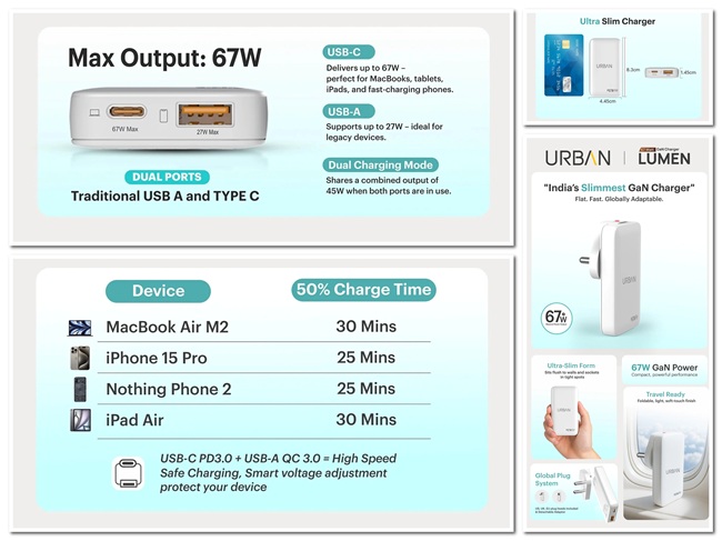 The Lumen, a 67W GaN charger that is among the thinnest in its class, was introduced by URBAN in India. With dimensions of 8.3 cm by 4.45 cm by 1.45 cm, the charger features a flat, compact body that is approximately the size of a credit card.