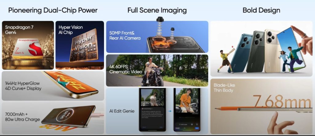 Realme has now progressed to the P4 generation after launching the P3 series earlier this year. Both phones feature big 144Hz OLED screens with 6.8″ diagonals (about) and massive 7,000mAh batteries that charge quickly at 80W.