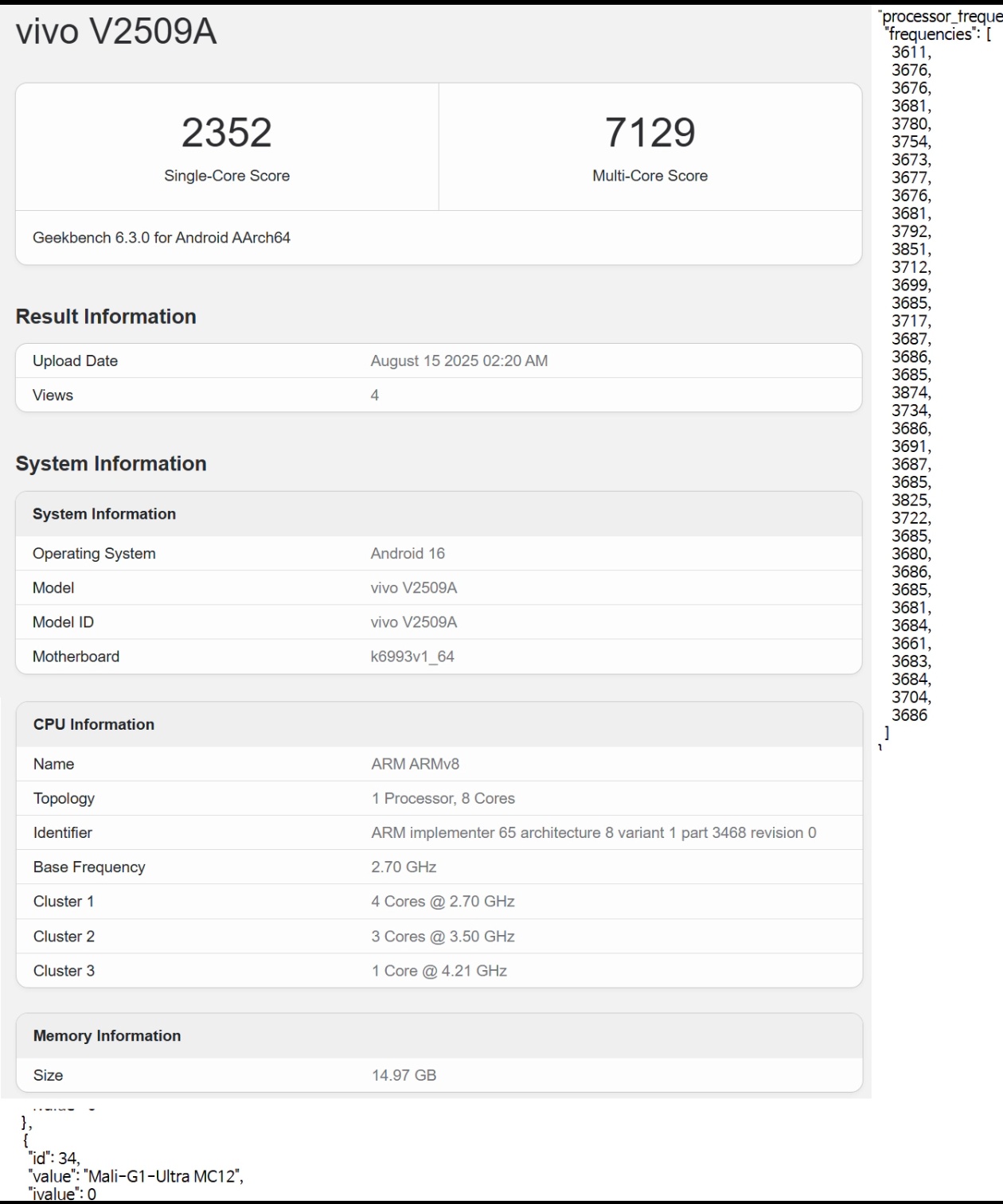 Interestingly, the test run shows that the GPU is labelled as Mali-G1-Ultra MC12, and the CPU of the Dimensity 9500 has one prime core clocked at 4.21 GHz, three cores clocked at 3.5 GHz, and four cores clocked at 2.7 GHz.