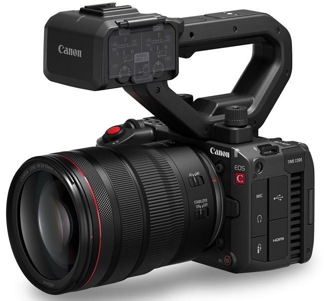 The EOS C50 features several accessory mounting points on a small, low-profile body. It has automatic menu and display adjustments and may be used either vertically or horizontally. Two 3-pin XLR inputs, a REC button, a zoom rocker, and control knobs are all included in its detachable handle.