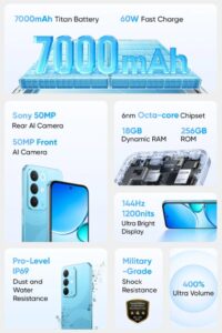 Besides the 7000mAh battery with 60W fast charging, Realme also confirmed a 50MP rear camera with a Sony sensor, a 50MP front camera, IP69 water and dust resistance ratings, 144Hz LCD screen, up to 1200 nits of peak brightness, and military-grade durability (MIL-STD 810H certification) that can withstand drops up to 2m and 400% volume.