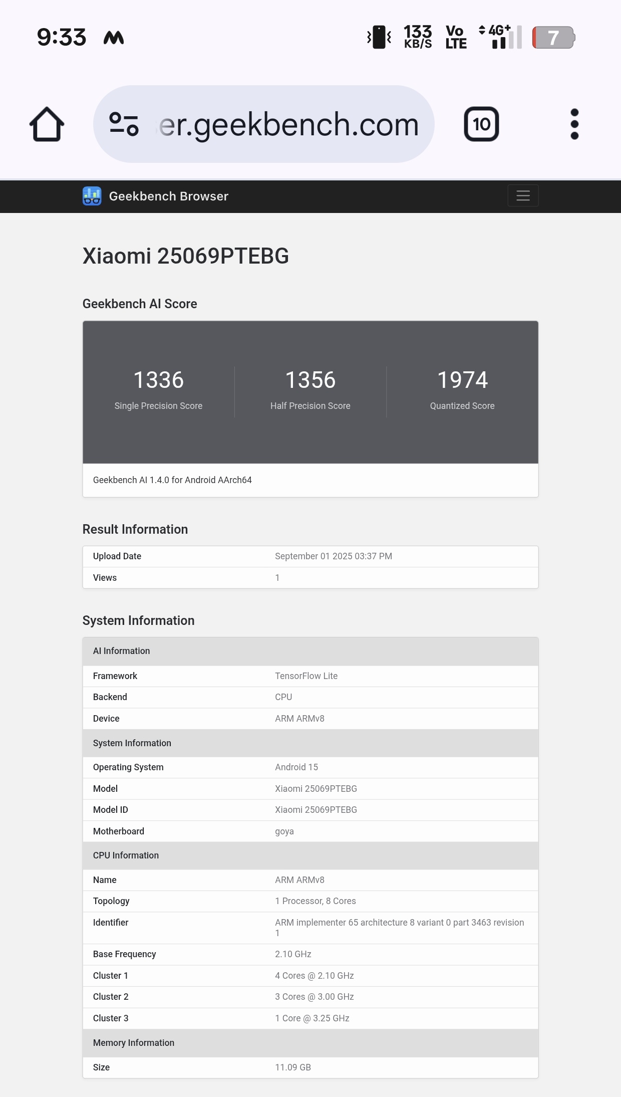 On Geekbench AI, the Xiaomi 15T, model number 25069PTEBG, scored 1,974 points in the quantised benchmark and 1,336 and 1,356 points in the single-precision and half-precision tests, respectively.