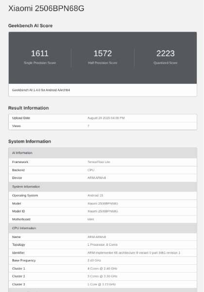 This device ran the benchmarks with the identifier 2506BPN68G. The results highlight its use of MediaTek’s Dimensity 9400+ chip, which achieves a peak speed of 3.73 GHz, alongside ARM’s Mali-G925 Immortalis MC12 graphics unit.