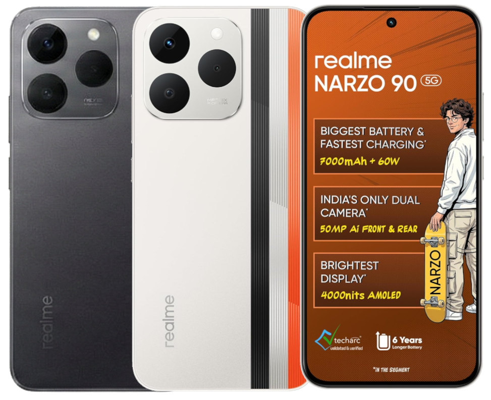 Narzo 90x is available in 6GB/128GB and 8GB/128GB configurations at INR13,999 and INR15,499, respectively. On December 23, it will be available through Amazon.in in India.